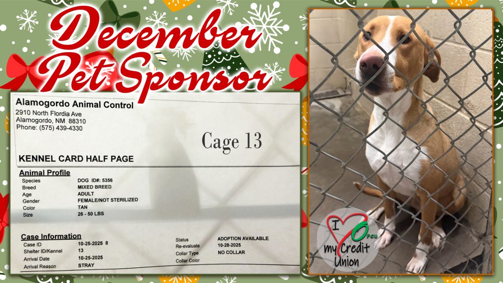 OFCU’s Sponsored Pet of the Month is a sweet and energetic Female Mixed Breed! OFCU has put $30.00 towards her adoption fees. For more information on how to make her or another loving pet part of your family contact the Alamogordo Animal Control Center today!